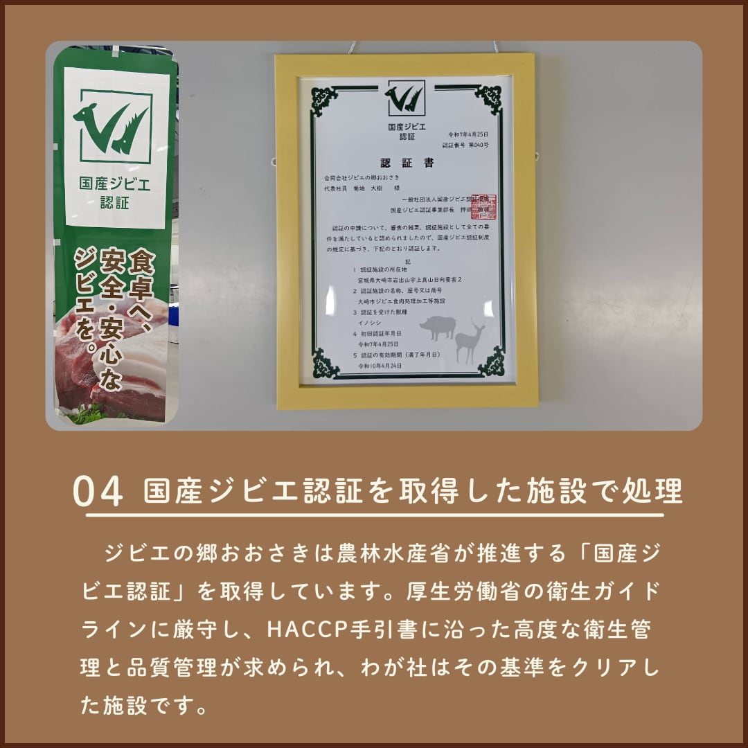 丁寧な「止め刺し」と、捕獲後すぐの搬入・解体による徹底した鮮度管理により、雑味を抑え、イノシシ肉本来の旨味を引き出しています。