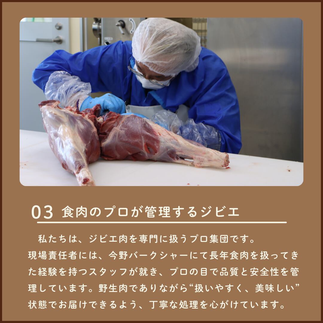 丁寧な「止め刺し」と、捕獲後すぐの搬入・解体による徹底した鮮度管理により、雑味を抑え、イノシシ肉本来の旨味を引き出しています。